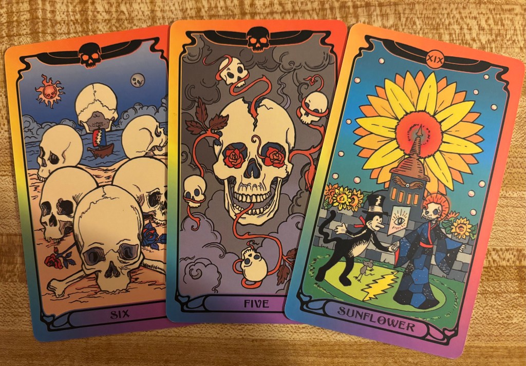 I’m talking about the Grateful Dead Official Tarot Deck, which I purchased a few days ago. It’s wildly different from my other tarot decks, with a Storyteller instead of a Fool and a Musician instead of a Magician. The suits of the Minor Arcana are Roses, Skulls, Bolts, and Bears, and each suit begins with a Terrapin instead of an Ace. The artwork is what any child of the 60s would expect: lots of skeletons, lots of color, and everything beautiful despite the bones. Card XIII is called River and, according to the guidebook, suggests that “sweet surrender can rock your soul and set you free.” I haven’t had the cards long, but I’ve gotten some good readings from them. The long, strange trip continues.